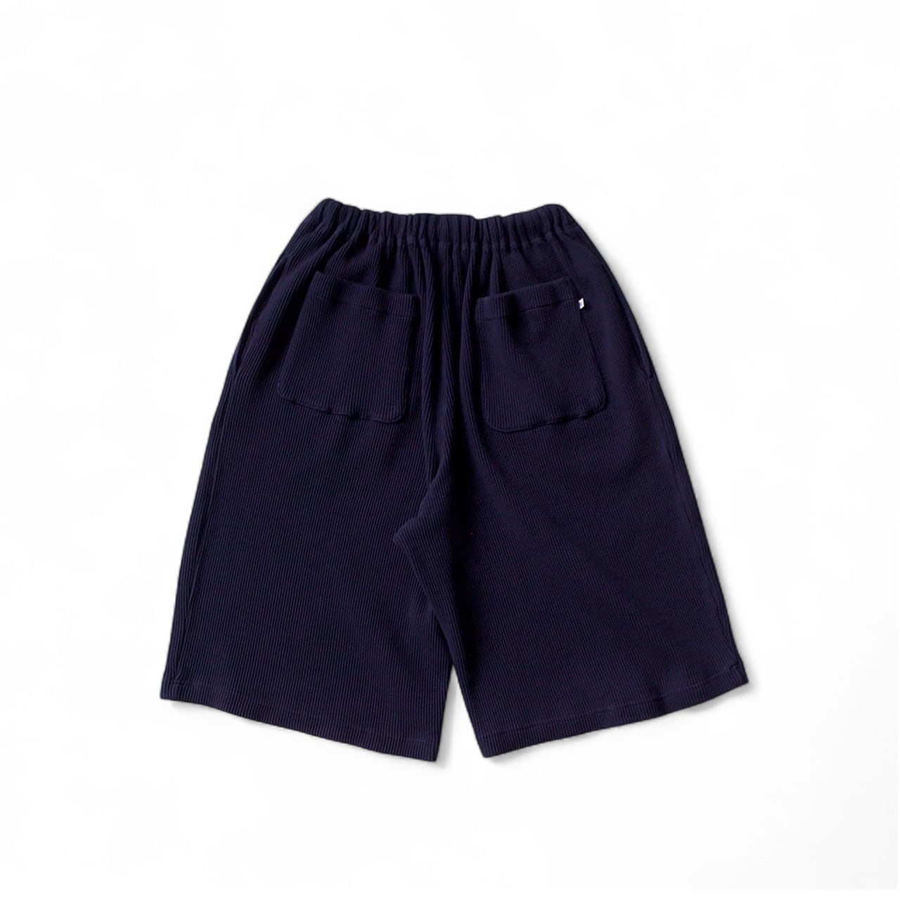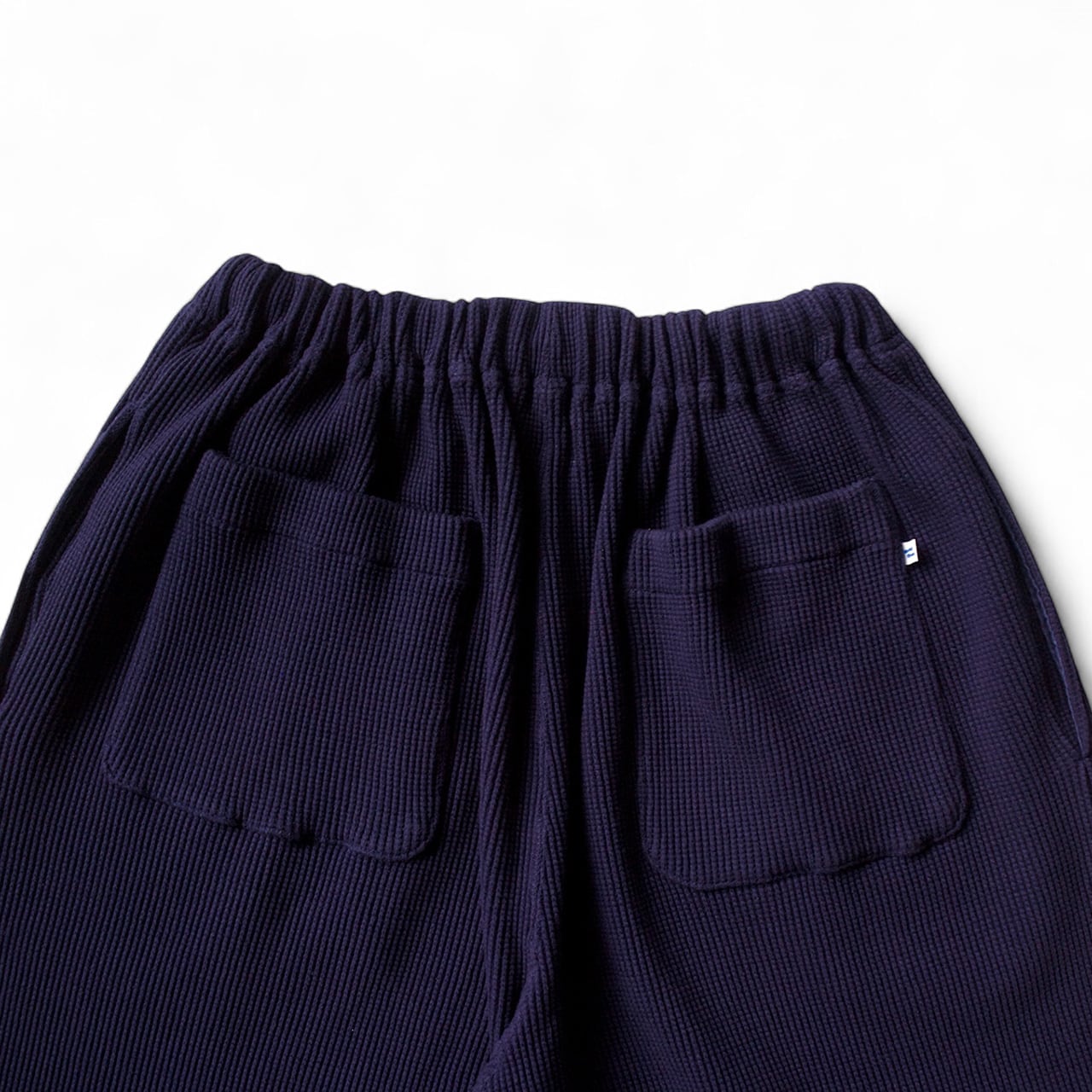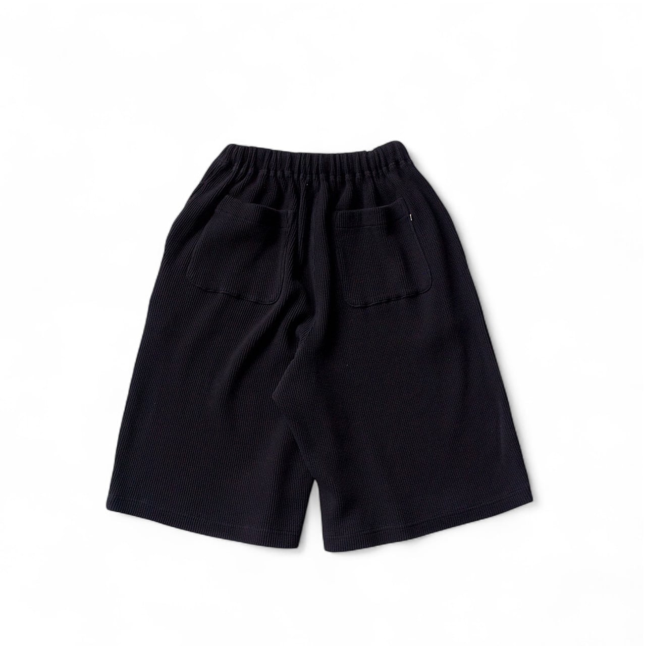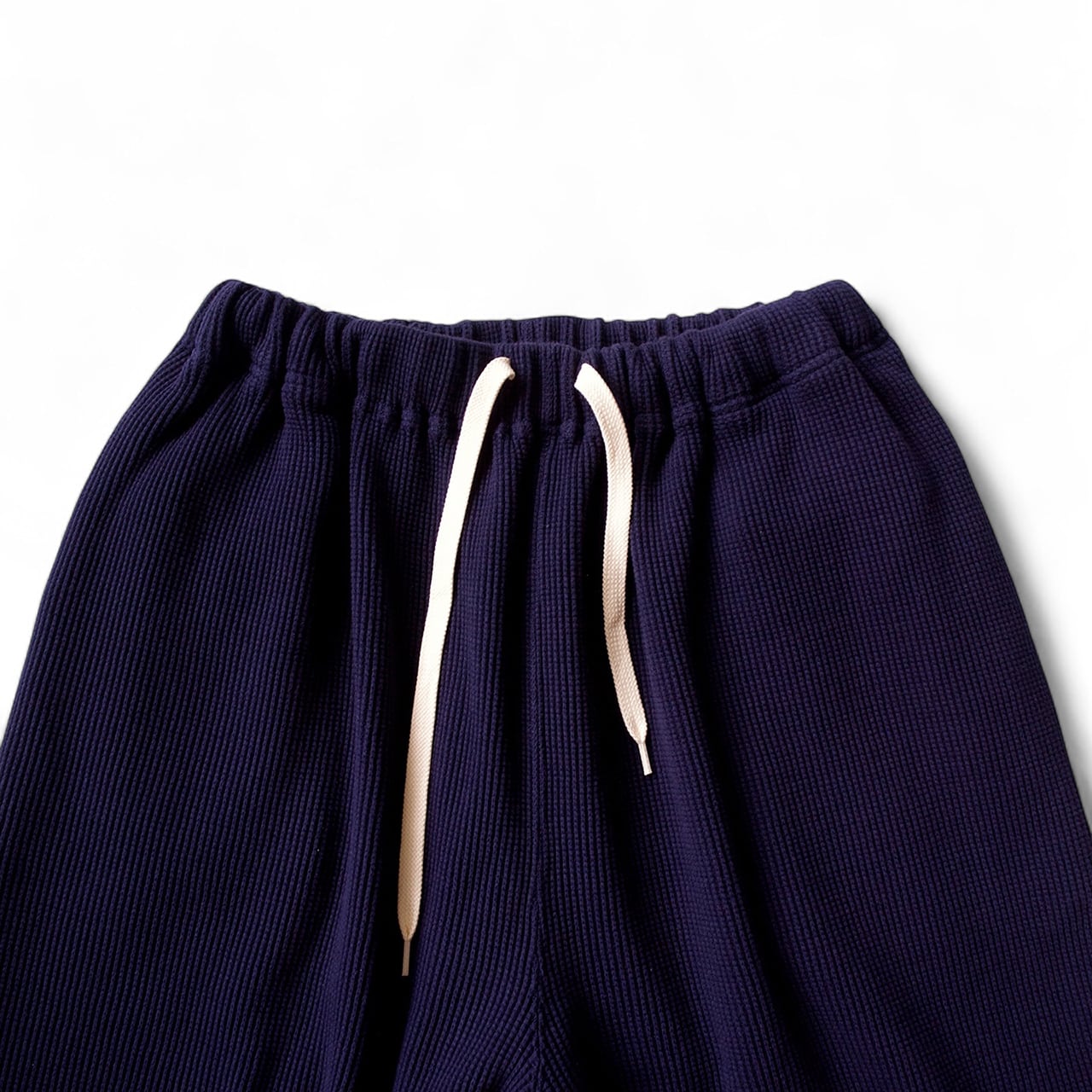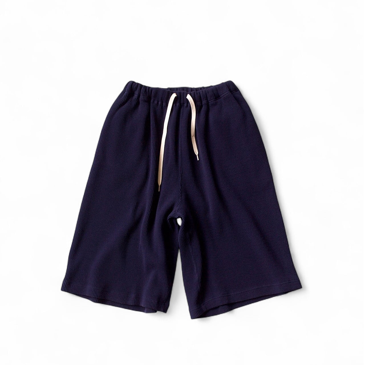 「秋冬でも穿けるショートパンツ」をコンセプトに作られた「度詰(ドヅメ)ワッフル」を使用した膝下丈のビッグショーツになります。