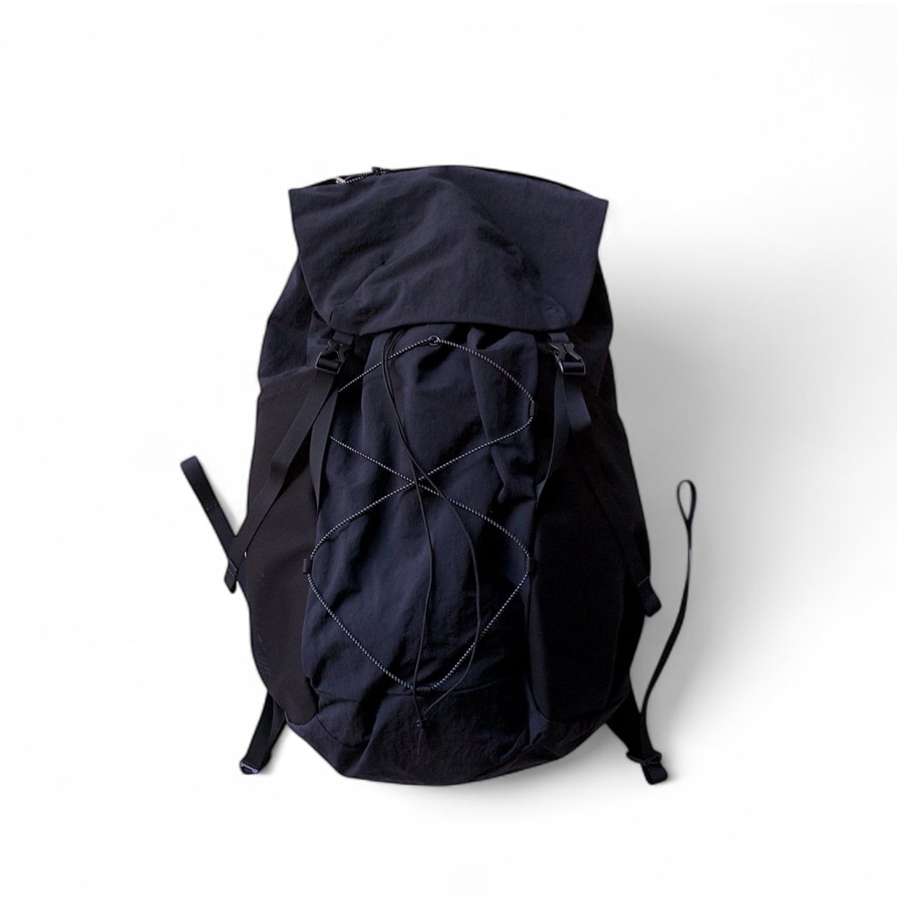 The bold logo and design of the UL backpack have been stripped away, and the material is a matte, wrinkled, water-repellent nylon that looks like natural fibers, rather than the glossy tech fabric often found in backpacks.