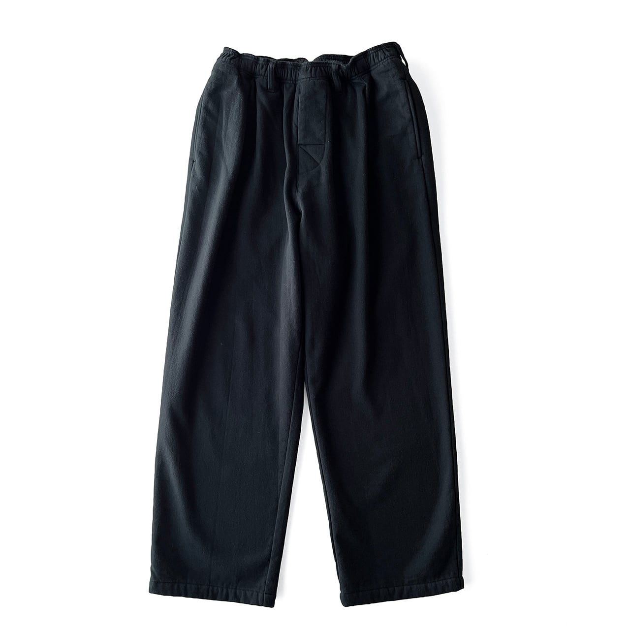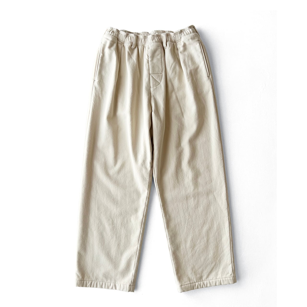 The silhouette is an updated version of the tapered Daily Slacks, with a rise and leg opening that take into account the thickness of the fabric.