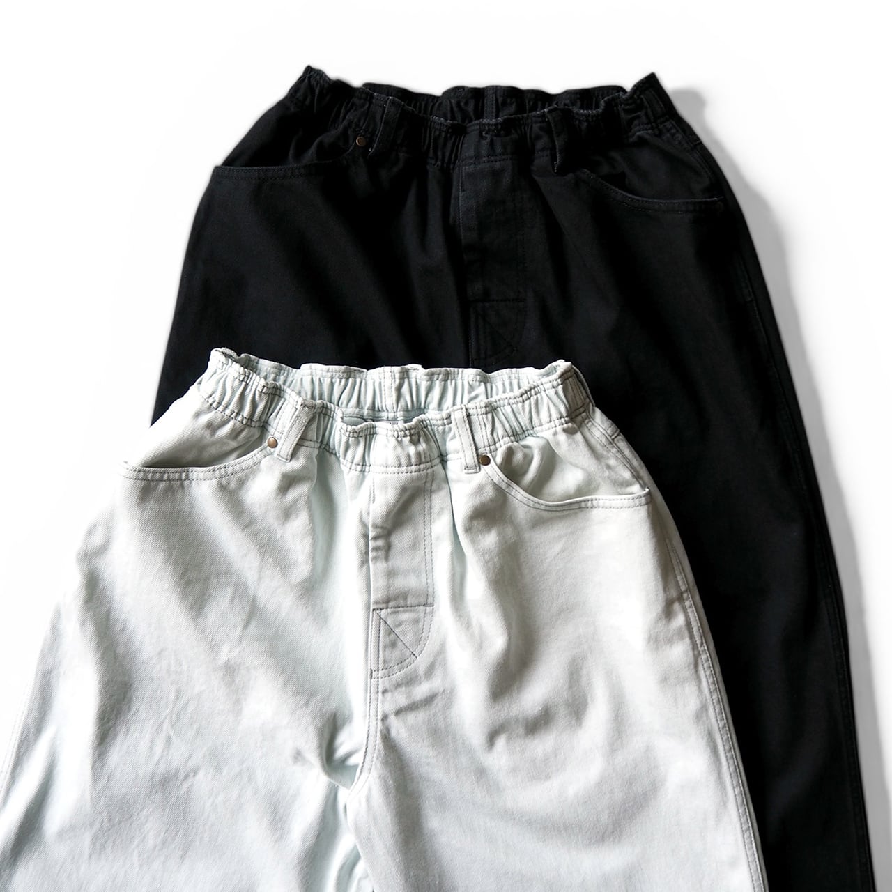 These are COMFORTABLE REASON's Surface Dyed Denim jeans.