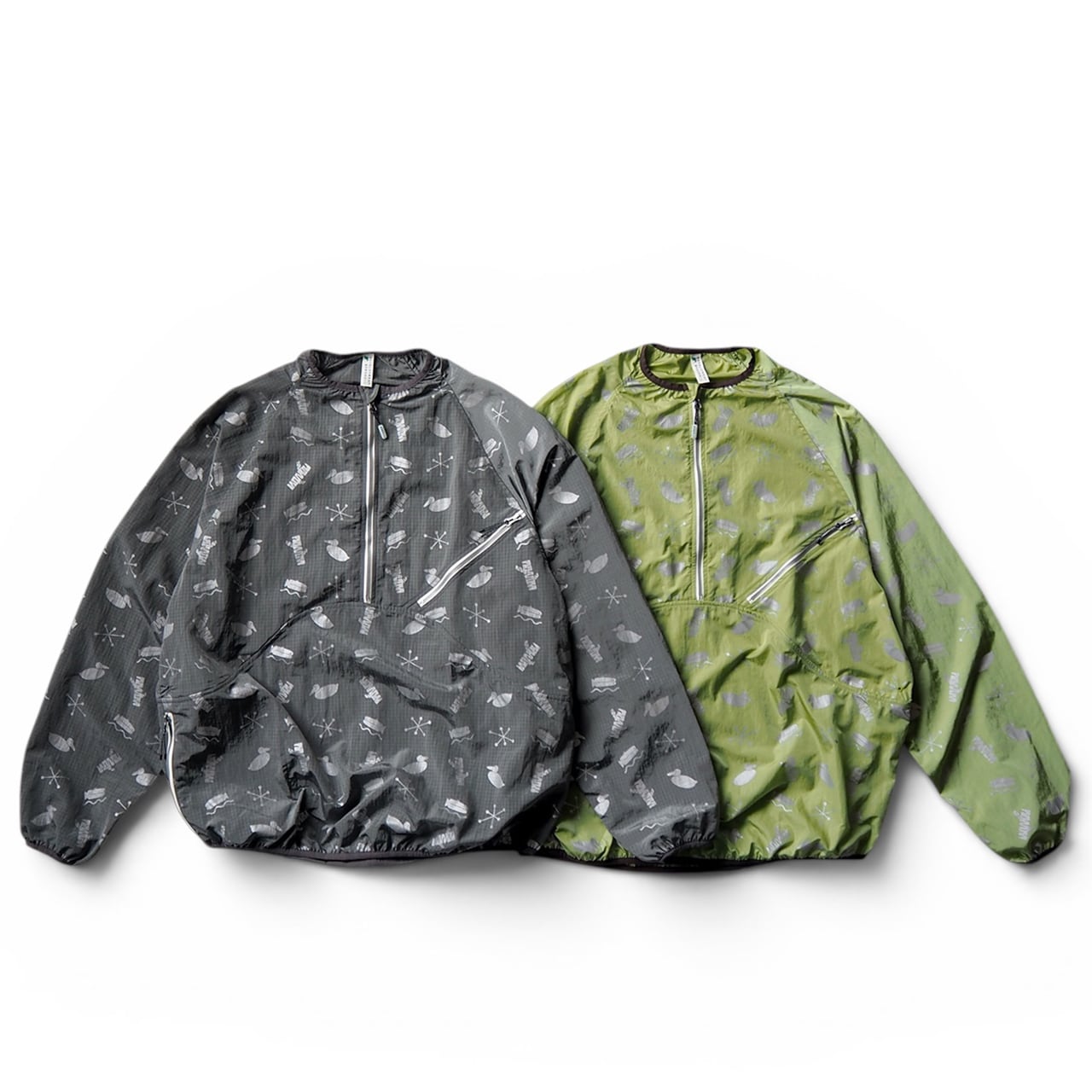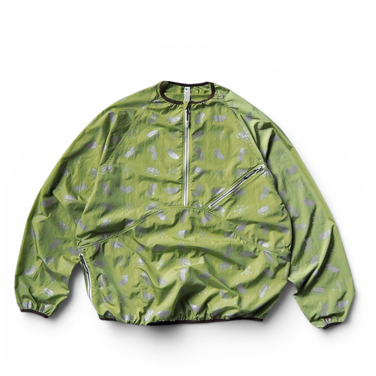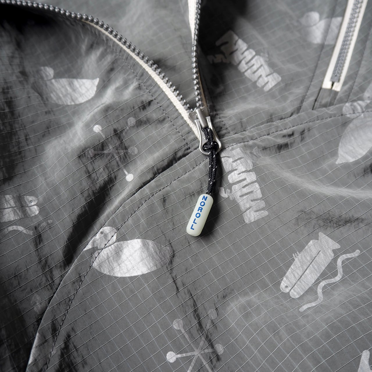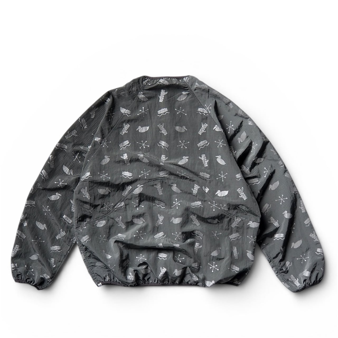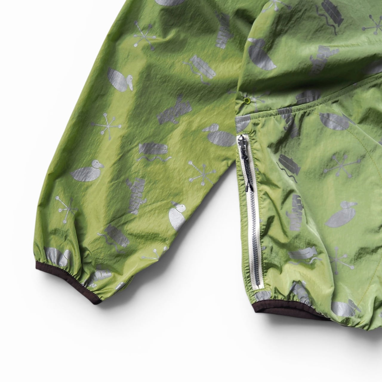 A nylon pullover featuring four motifs printed with reflective ink.
