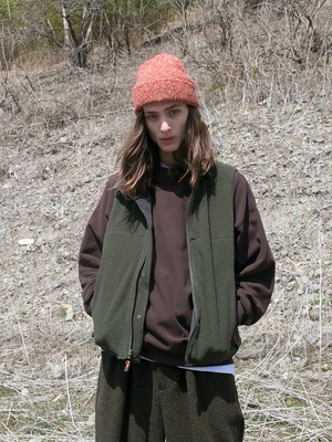 This knit cap features a random pattern created by blending high-quality wool yarn with cotton slub.