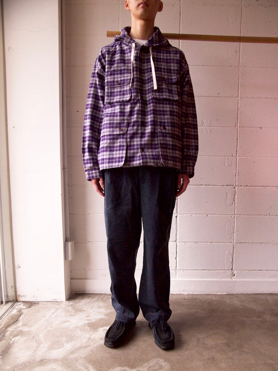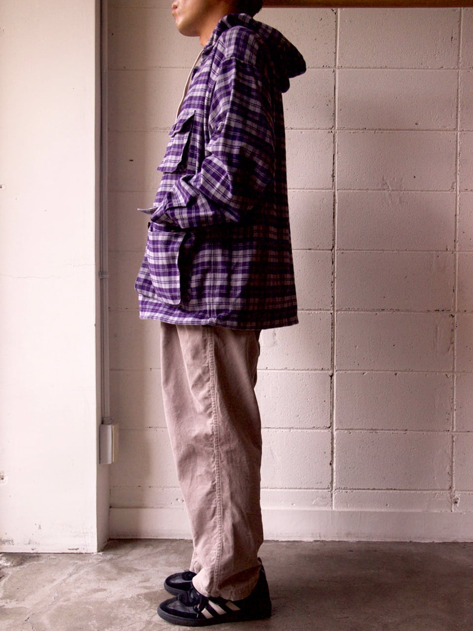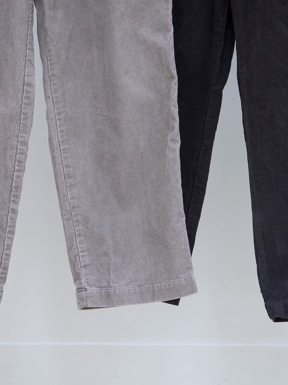 このコーデュロイパンツは、ウエストとヒップ周りは今までの定番のパンツのサイズ感そのままで、ワタリから下のシルエットを細くしています。