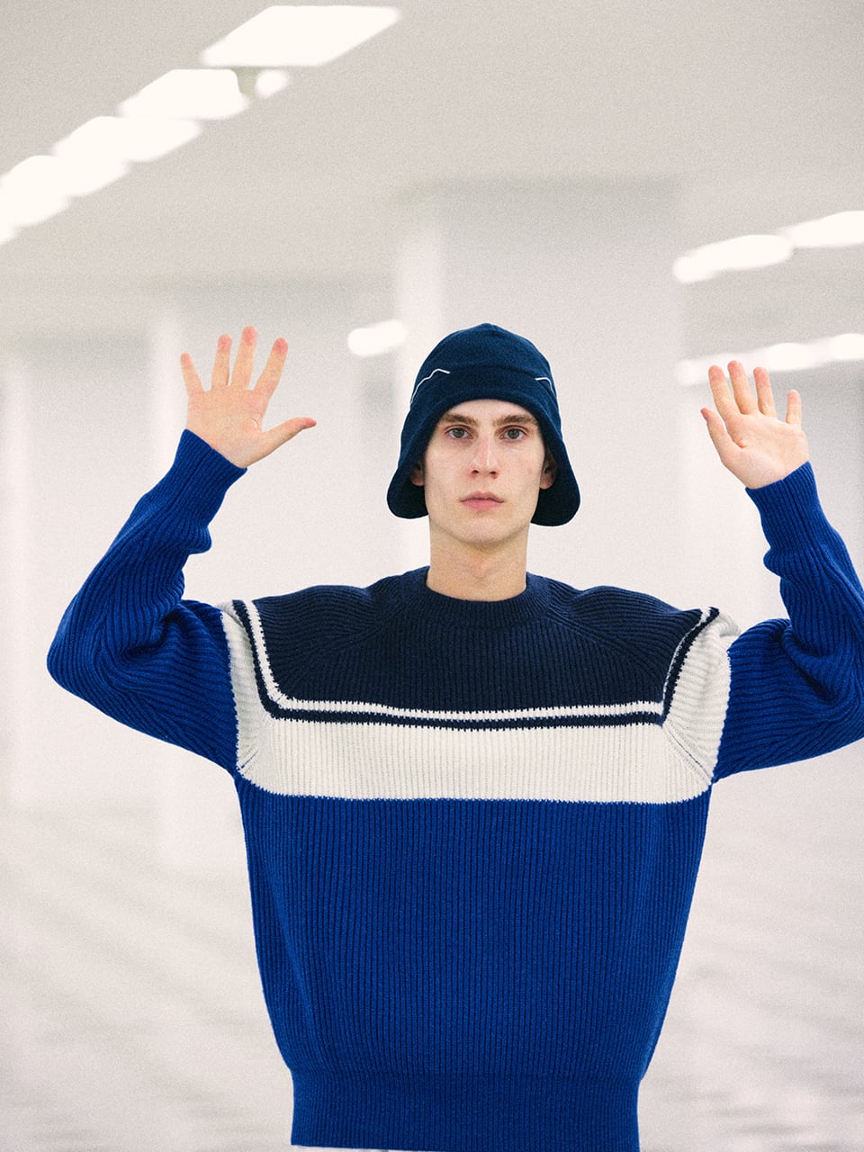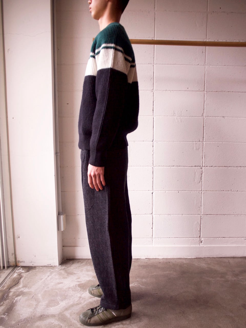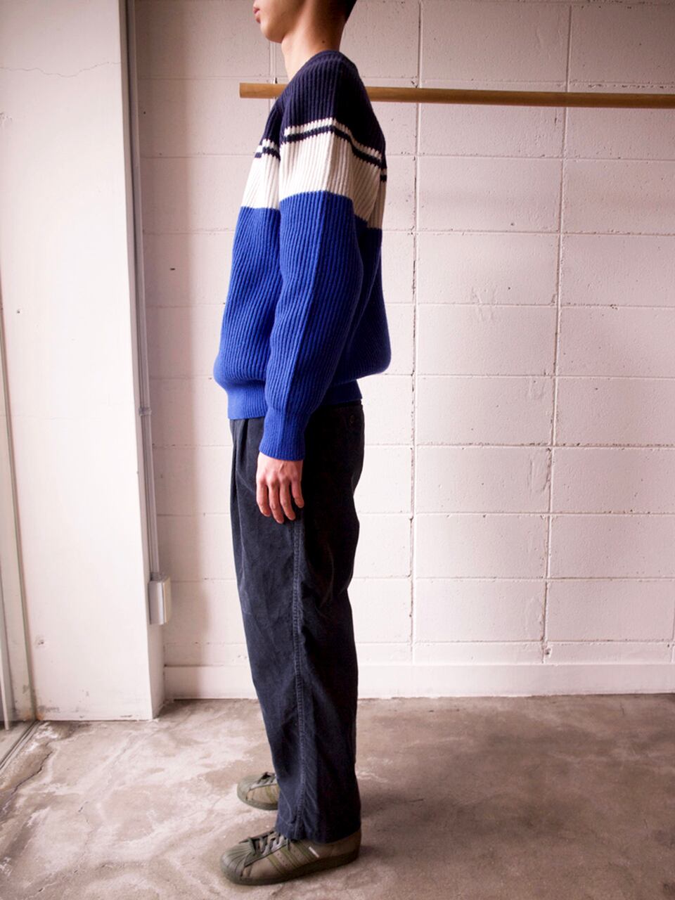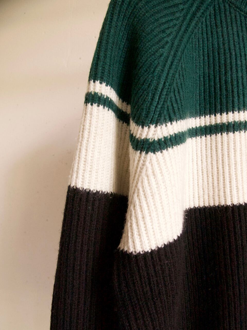 80sフットボールカルチャーのトラックトップからインスパイアされたパネル配色のニット。