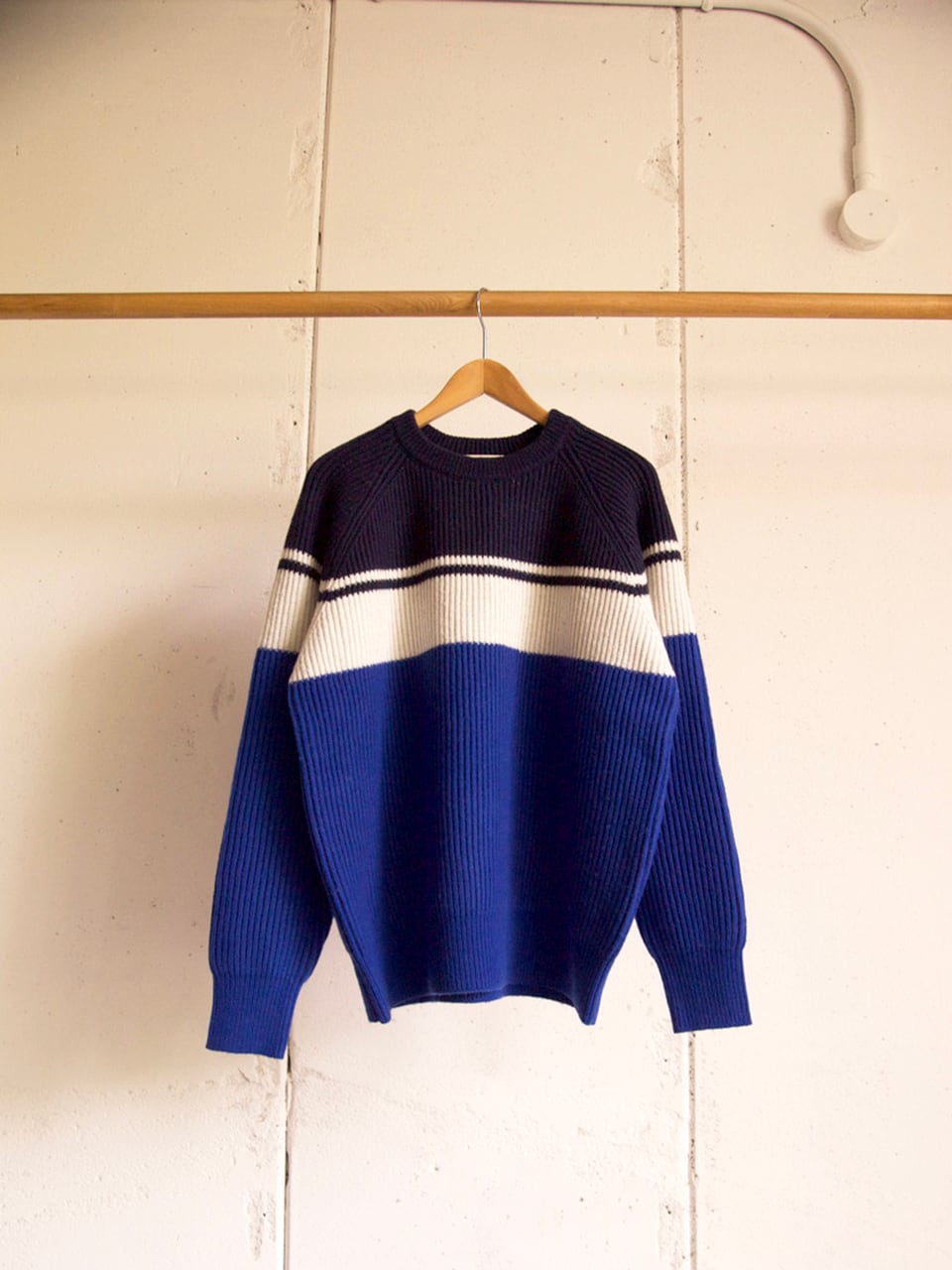 This knit features a paneled color scheme inspired by the track tops of '80s football culture.