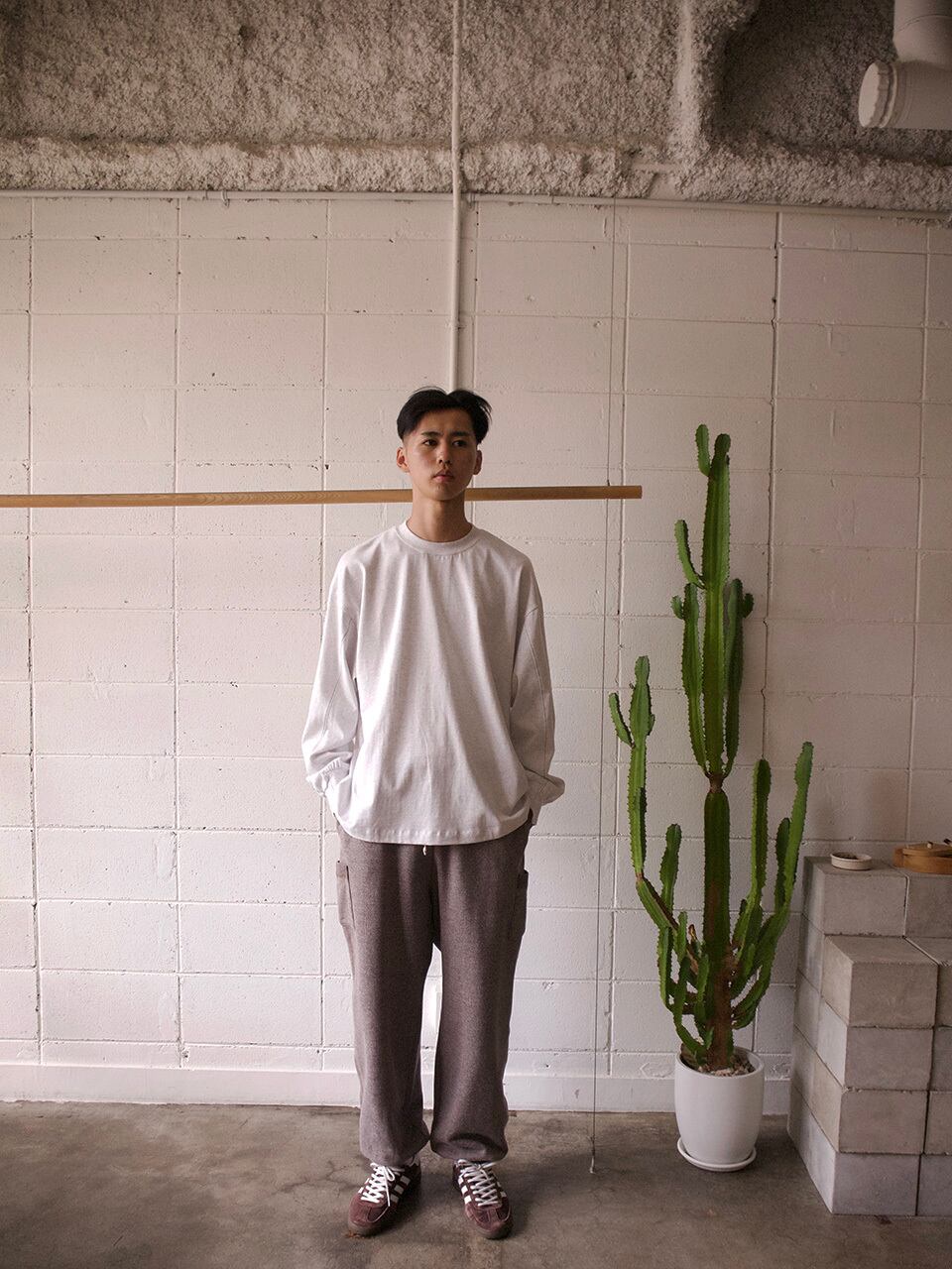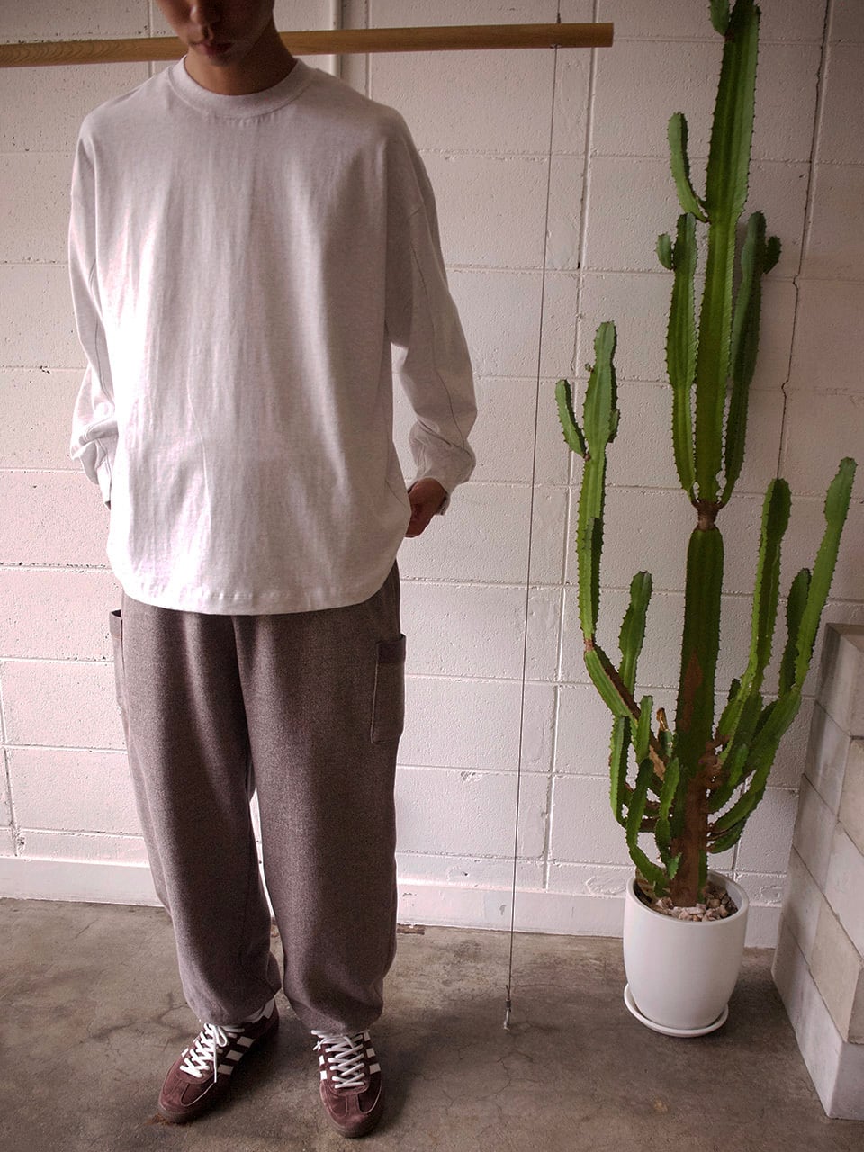 ごま塩のような独自な色合いを表現している点が特徴的な三子撚り裏毛素材のスウェットパンツ。